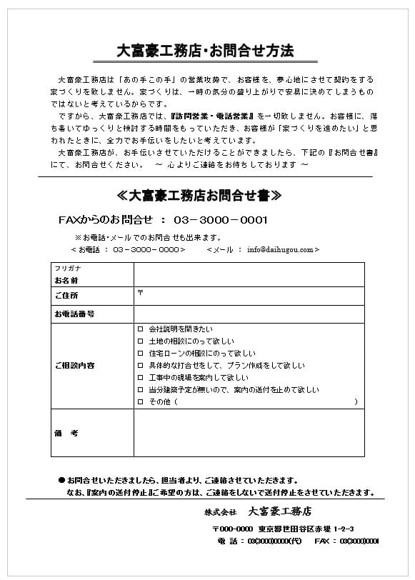 こちらは、資料請求やお問い合わせがあった時にお客様にお渡しする書式となります。