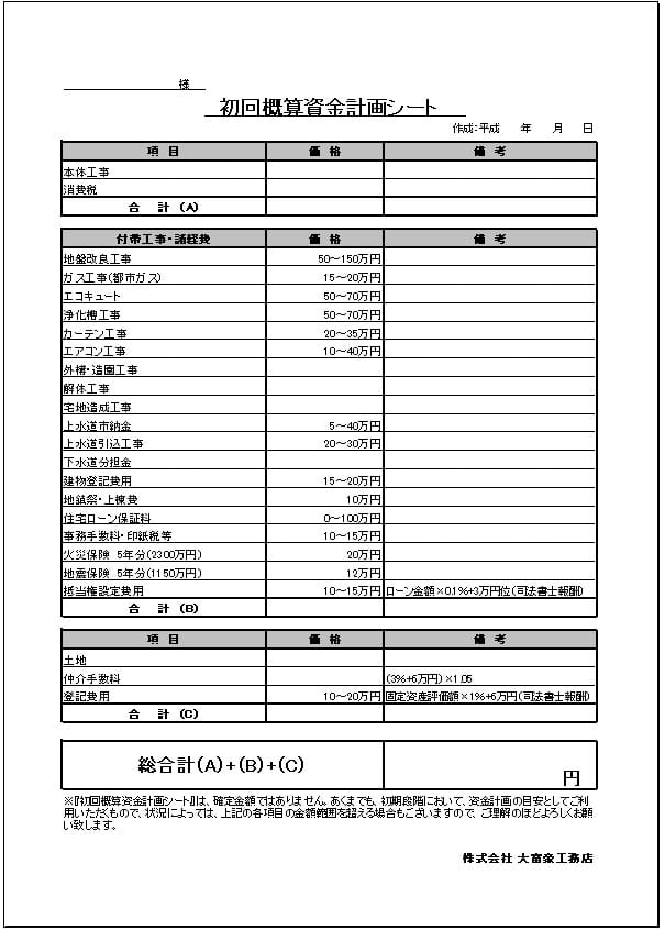 「初回概算資金計画シート」は、時代や貴社バージョンに合わせて簡単に変更できますので、最初のプラン要望聞き取りの時に活用してください。